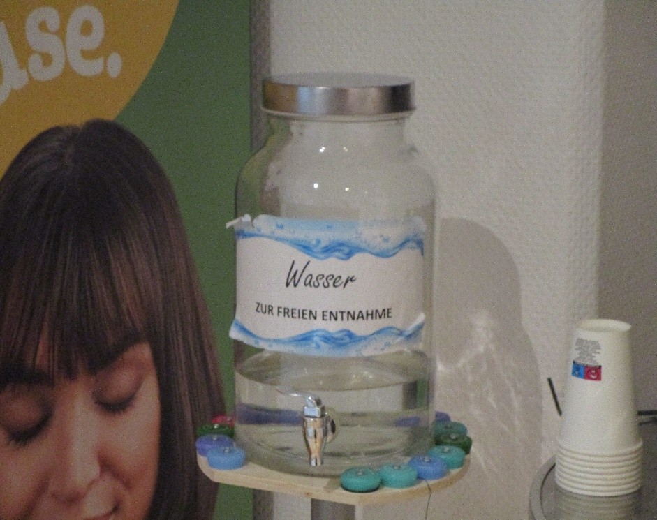 Um die Zahl der gekauften Plastikflaschen zu reduzieren und Wasser als idealen Durstlöscher zu fördern, wurde in einem Mini-Pilotprojekt ein großer Wasserbehälter aus Glas besorgt, an dem sich alle Teilnehmer_innen des JBZ beliebig viel Trinkwasser nachfüllen können.