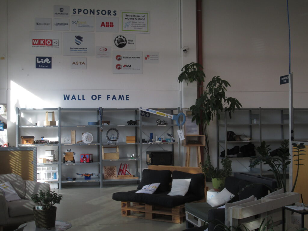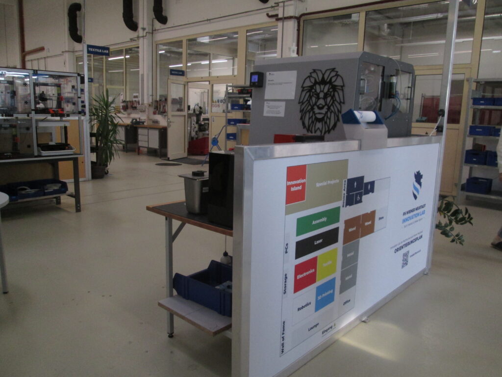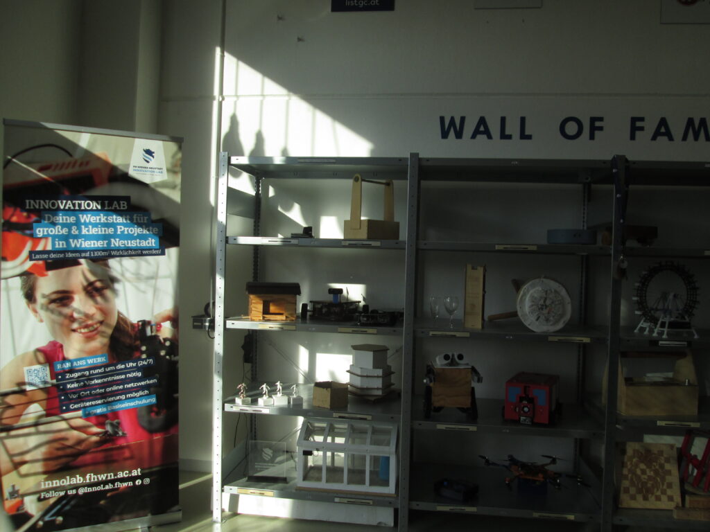 Julian erklärte uns, wie wichtig es ist, unterschiedliche Materialien und Techniken zu kombinieren, um innovative Lösungen zu finden. So arbeiten auch große Unternehmen selbst im Innovation Lab an ihren Großprojekten und Studierende wie auch Vereine oder Privatpersonen können mit der Mitgliedschaft rund um die Uhr die vielen Stationen für ihre Ideenumsetzung nutzen. An der „Wall of Fame“ können bereits entstandene Projekte unterschiedlichster Materialien bewundert werden: Vom Roboter über Drohnen bis hin zu Holzkonstruktionen und Metallarbeiten ist alles dabei.