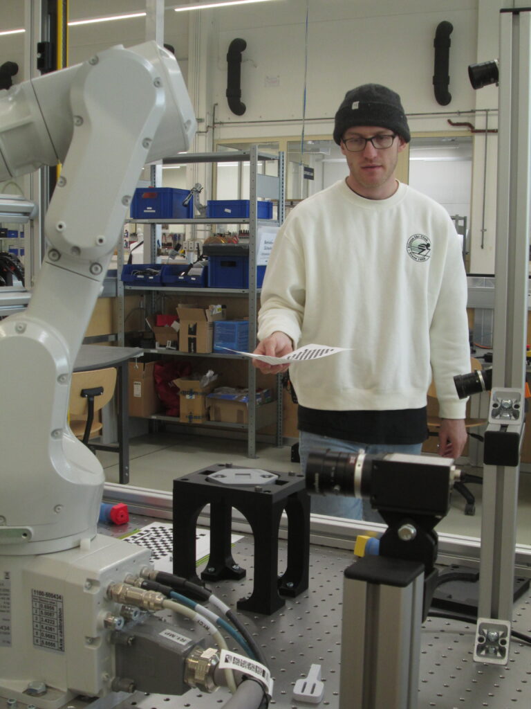 Auch die Roboterarme waren interessante Schauobjekte. Julian erklärte den Einsatz in der Autoindustrie oder auch in der Sortierung von Obst und Gebäck am Förderband. Roboter können überall eingesetzt werden, wo der Mensch körperlich anstrengende oder gefährliche Aufgaben zu bewältigen hat und sind somit hilfreich in der Produktion. Wie Roboter kalibriert und gesteuert werden hat uns besonders interessiert.